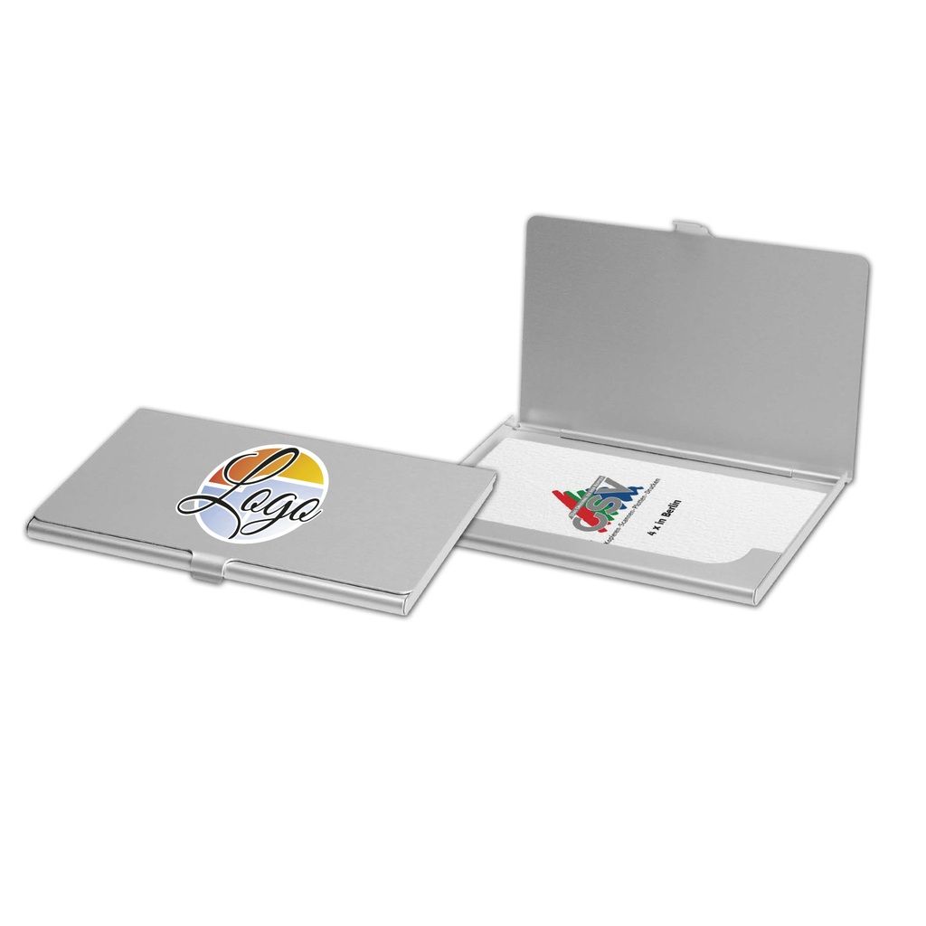 Die Visitenkartenetuis aus gebürstetem Aluminium sind 60 x 95 x 5 mm (HxBxT) groß. Sie sind in der Farbe silber erhältlich. Der Druckbereich für Ihr Wunschmotiv beträgt 55 x 90 mm.